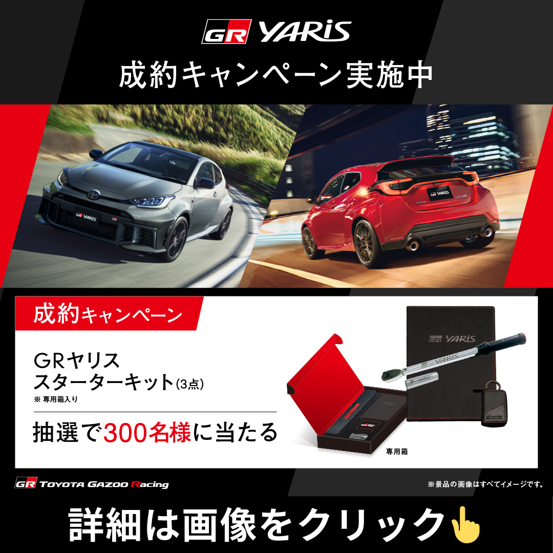 【GRヤリスご成約キャンペーン】GRヤリスをご成約いただくと抽選300名様に「GRヤリスグッズ」プレゼント中!