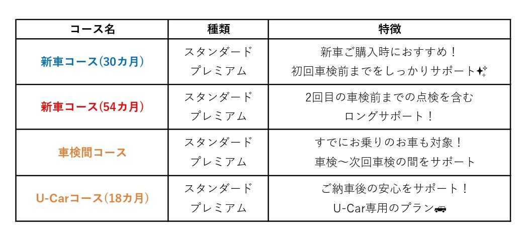 新車コース(30か月/54か月)、車検間コース、U-Carコースの