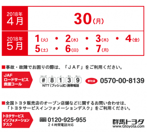 ☆ゴールデンウイーク休業日のご案内☆~群馬トヨタ館林インター店~