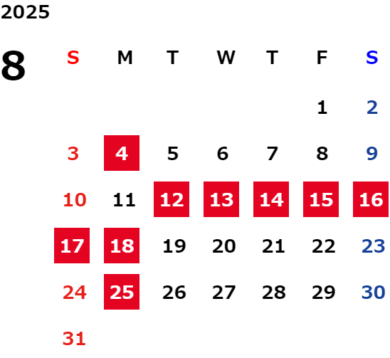 12日(火)~18日(月)夏季休業