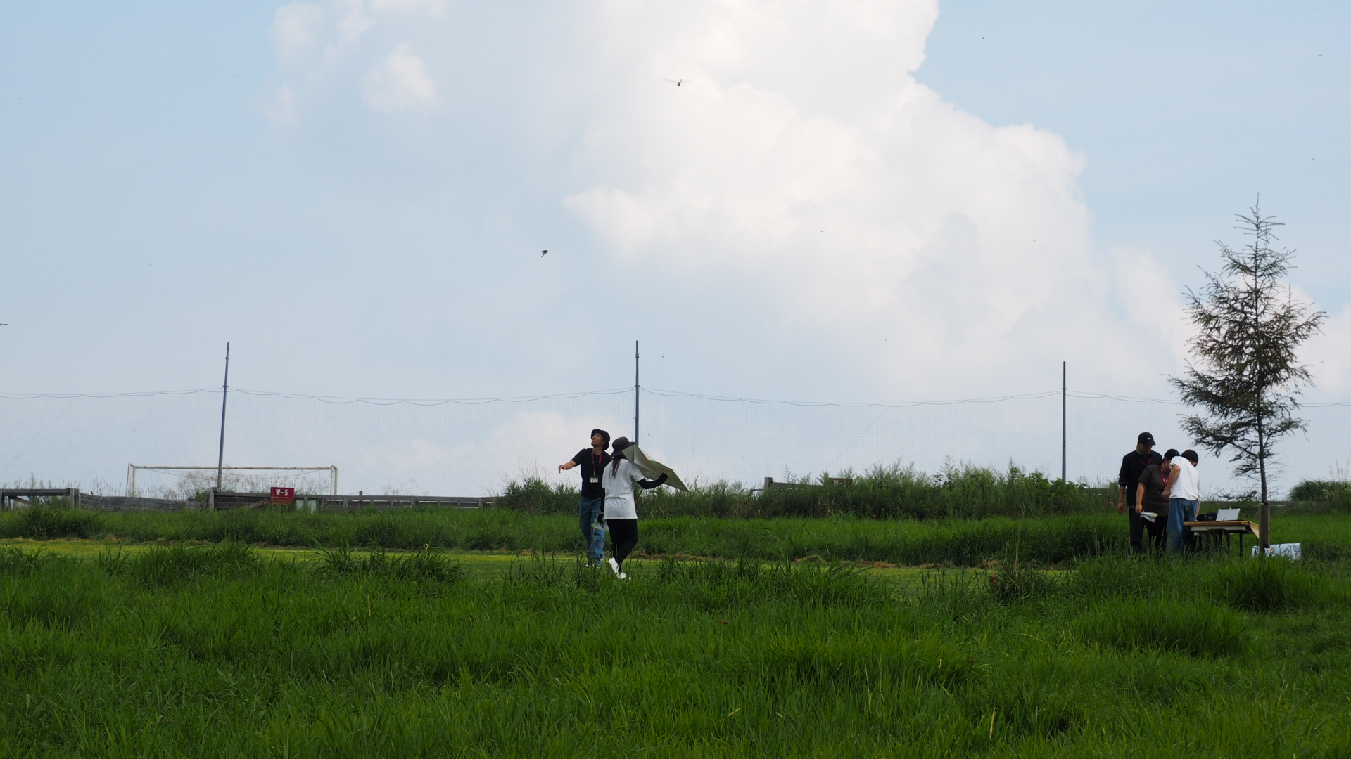 眺めのいい草原で紙ヒコーキを飛ばして距離を競いました