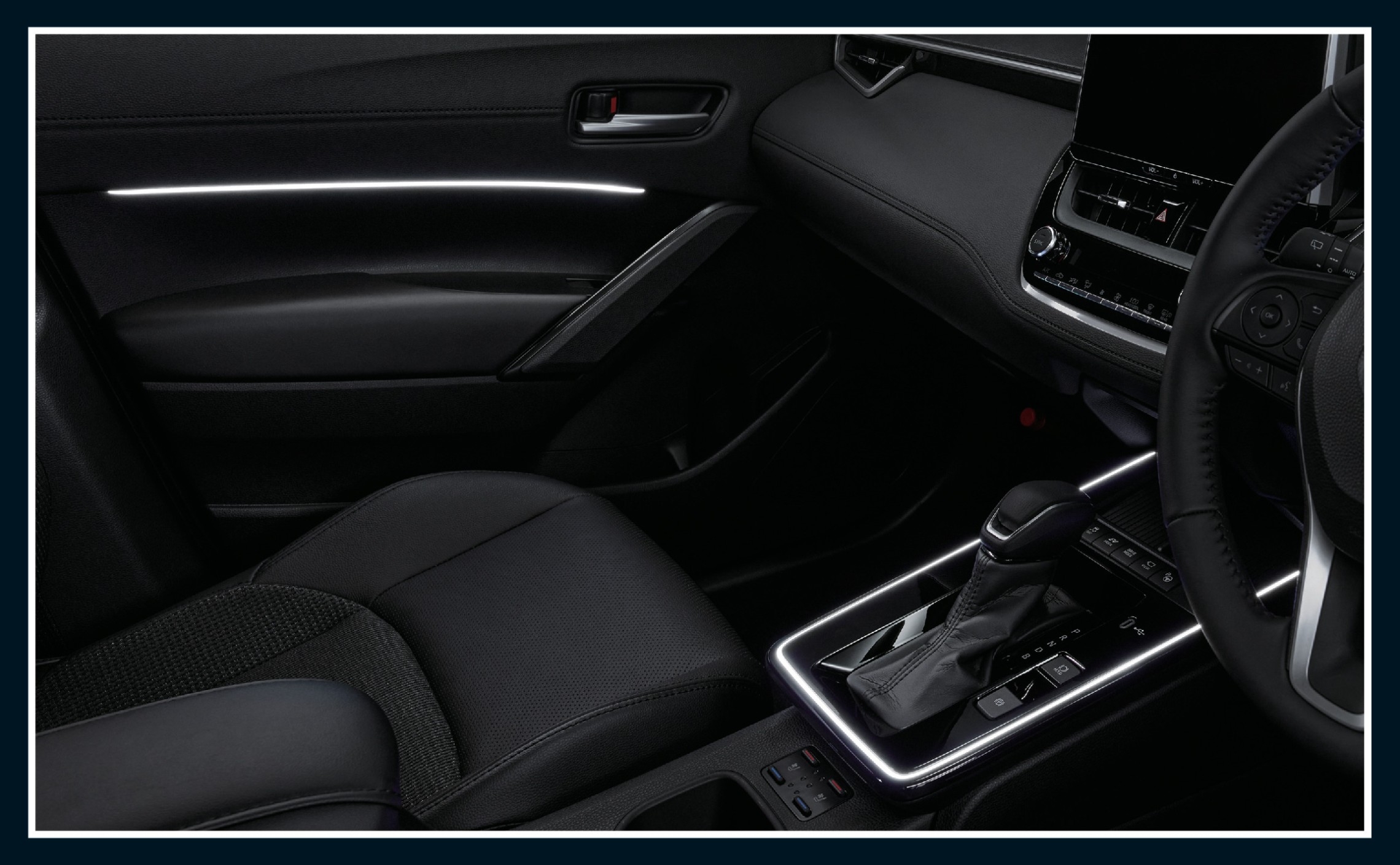 ドアの解錠/施錠・ドアの開閉時には、ルームランプをはじめとした照明が自動的に点灯・消灯し、乗る方を優しく迎えます。センターコンソールランプとフロントドアトリムショルダーランプは走行中も常時点灯します。