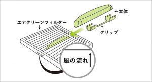 ①エアコンフィルターにクリップで止めるだけなので