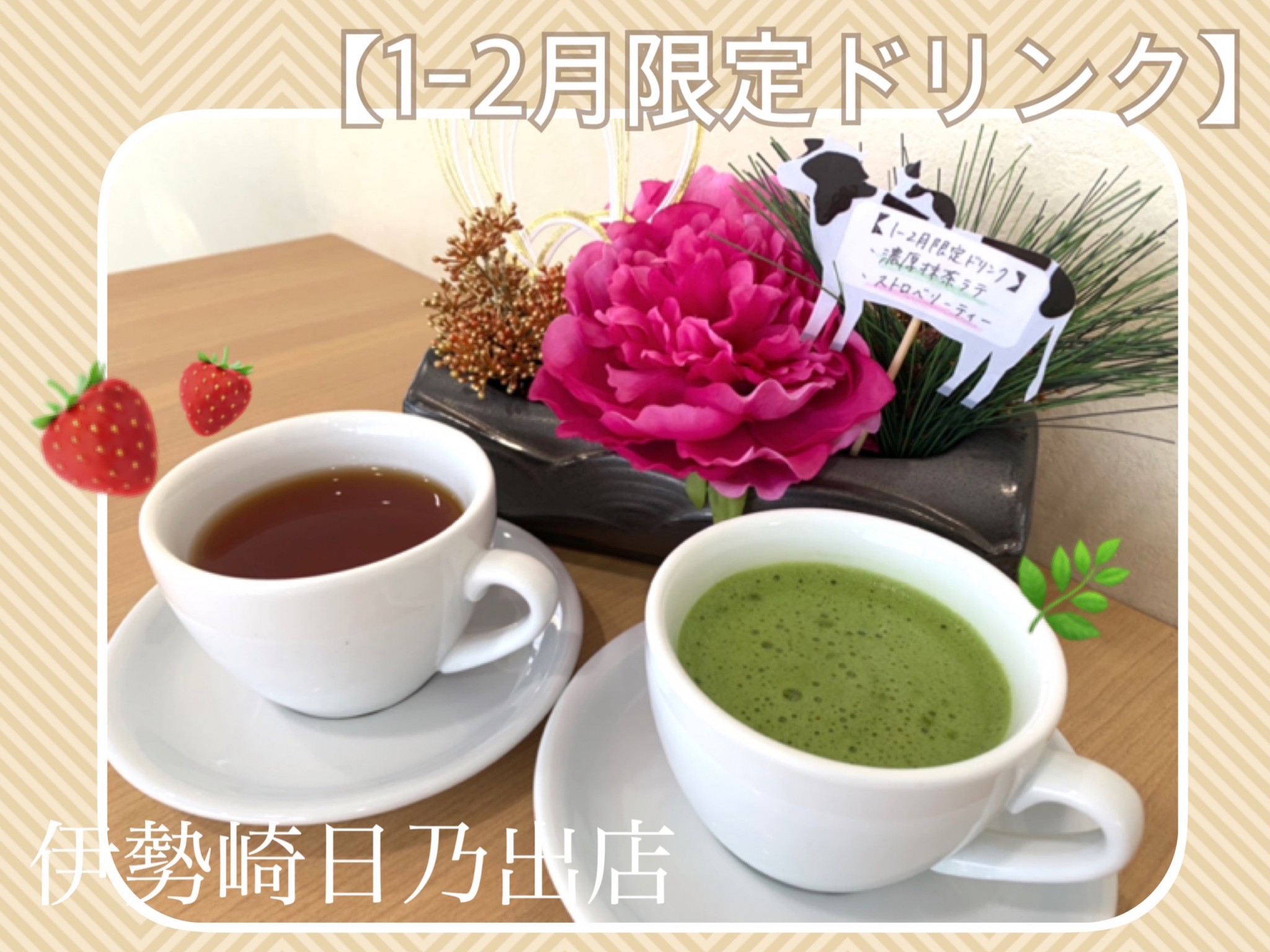 【新ドリンクメニュー】濃厚抹茶ラテ・ストロベリーティーが登場!~伊勢崎日乃出店~
