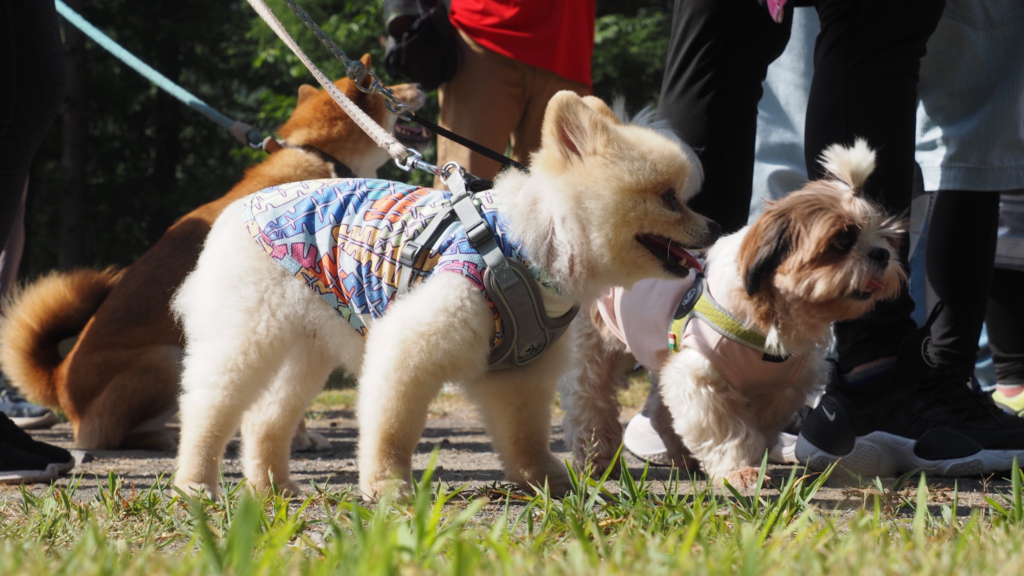大人から子供まで、わんちゃんも一緒に朝の散歩を楽んで